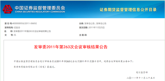 乔丹体育于2011年11月25日通过了2011年中国证券监督管理委员会发展与审查委员会第263次会议的审议,并获得通过。这意味着乔丹体育已经站在了a股市场之外。但是直到今天,乔丹体育还没有获得批准。