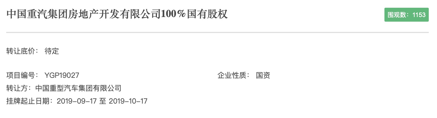 这并不是中国重卡集团有限公司第一次将其房地产开发产权上市。去年9月17日,中国重汽集团股份有限公司将其房地产开发有限公司100%的国有产权在山东产权交易中心挂牌上市。当时价格“待定”。为期一个月的公告期吸引了1000多名观众。然而,这笔交易并没有最终敲定,而是以“到期撤回”的方式被取消。