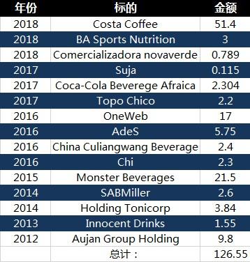 资料来源:可口可乐2017年度报告根据可口可乐自己的总结,从2012年12月31日到2017年12月31日,同行基本上与S&P 500并列,累计收益率达到100%,而同期可口可乐仅为股东创造了50%。显然,可口可乐并没有那么强大。相对而言,资本市场已经给出了答案。可口可乐在过去的5年里花费了超过120亿美元收购可口可乐。它曾被称为世界上少数几家专注于单一业务的大公司之一。然而,碳酸饮料的缓慢增长使可口可乐在过去几年疯狂收购和创新品牌,以实现多元化经营和平衡潜在风险。据PitchBook统计,自2012年以来,仅披露金额的M&A投资交易总额已达126.55亿美元,另有10多笔交易未披露交易金额。如此密集的投资和合并显示了可口可乐多元化战略的决心。可口可乐自2012年以来部分收购(披露金额)。