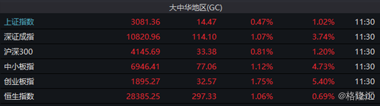 交易提前恢复:香港和a两个城市经历了强劲复苏,黄金和石油行业集体回落。上证指数和深证指数分别上涨0.47%和1.07%,至3081.36点和10820.96点。创业板市场强劲,盘中突破1900点,半天上涨1.75%,至1895.27点。这两个城市的营业额超过4200亿元,2836股上升。华北地区净流入59亿元人民币。