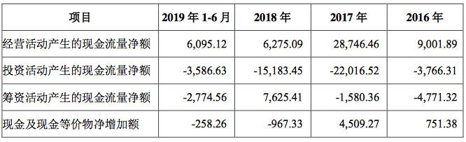 此外,报告期内,经营活动净现金流量分别为9018.9万元、28746.46万元、6275.09万元和6095.12万元。现金及现金等价物净增长从2016年的751.3万元降至2018年的-967.3万元,2019年上半年保持在-258.26万元。