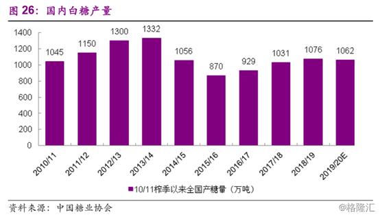 据中国糖业协会统计,最近一轮增产周期的最高点是13/14压榨季1332万吨,然后开始减产,15/16压榨季达到870万吨的阶段性低点,开始增产。在18/19压榨季节达到1076万吨的高峰后,新的减产周期将从19/20压榨季节开始。根据协会的预测,今年国内工业产量将下降到1062万吨。
