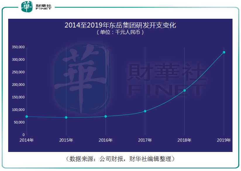 值得注意的是,尽管东岳集团在2018年经历了隐性利润担忧,甚至在2019年业绩下滑,但公司研发支出仍继续高速增长。据蔡华通讯社统计,东岳集团此前的数据显示,该公司研发支出的高增长始于2017年。2017年至2019年,公司研发支出分别为9469.9万元、1.77亿元和3.29亿元,年增长率分别为27.9%、87.5%和85.6%。