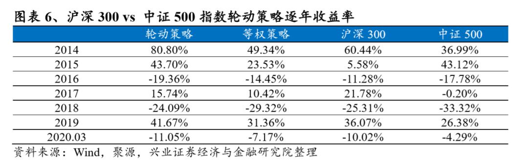 3.指数轮换策略:同时,根据模型的预测结果,动态选择配置沪深300或中国证券500指数构建指数轮换策略。沪深300与中国证券500指数轮换策略(2014/1-2020/3)的年化收益率为的12.15%,夏普比率为0.45,明显高于等权重策略的4.06%和0.16%,市场价值择时效果更好。