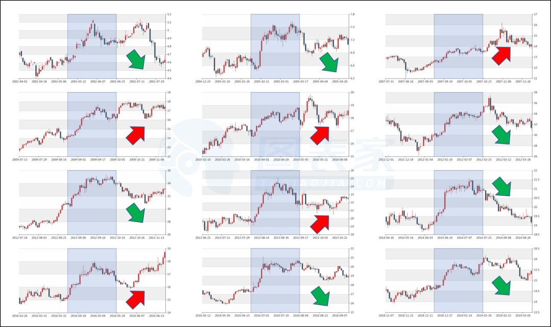 从上图可以看出,在这12条类似的曲线中,白银价格在未来30个交易日涨跌的概率各为50%,这意味着白银投资者应该等待并观望2月份的确切涨跌信号。