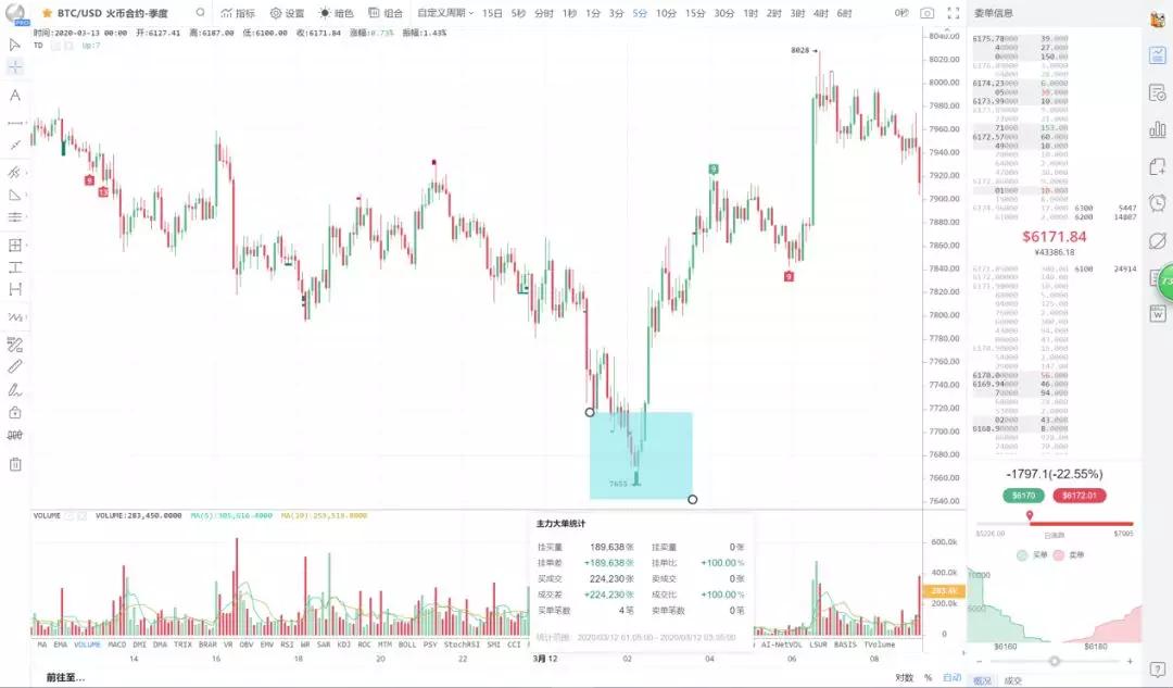 AICoin PRO版本k线主要订单的追踪显示,3月12日凌晨2点左右,在7600-7700范围内的大量订单的引导下,比特币跌至最低7635美元。该头寸的交易总数为7笔火币和OKEx的BTC季度合约,购买了价值超过4000万美元的订单。主要玩家数量增加后,价格迅速反弹,在上午7点左右涨到8000多美元